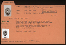 | References: | Publication: Agora VII Publication Page: Agora 7, s. 228, p. 212 Publication Page: Agora 7, s. 230, p. 214 Image: 2012.81.0296 (95-12-31) Deposit: Q 13:4 Card: L 905 |