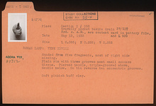 | Description: | Mended from five fragments, most of right side missing. Plain rim with three grooves next small concave discus. Pierced handle, triple grooved above, double below. On the reverse, two concentric grooves. Soft pinkish-buff clay. Type XXVIII of Corinth collection. | |