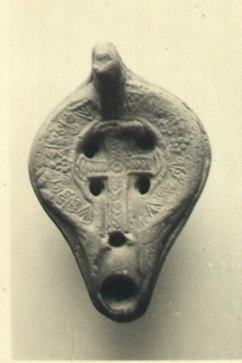 | Description: | Convex sides. On rim, a band of triangles, oak leaves, clover leaves and dotted pyramids in low relief. On discus, a Christian cross monogram with herringbone in the arms and a circle at the center. Solid knob handle. On the reverse, within a double bounding line, a palm branch with circles at one end on either side. Unglazed, but with slip of the same color. Pinkish-buff clay. Type XXXI of Corinth collection. | |