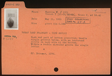 | Description: | Back and part of bottom preserved. Handle single grooved below, with an impressed circle on each side at the bottom. Within a double circular groove, the single letter: "A". Type XXVIII of Corinth collection. Cf. Corinth IV, ii, no. 1372. | |
