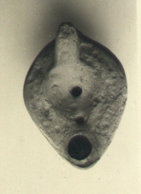 | Description: | Chips from sides missing. Convex sides. On rim, debased herringbone. Plain discus, with two holes. Solid handle, with double groove above, worn away below. On reverse, design effaced. Buff slip. Pinkish-buff clay. Type XXVIII of Corinth collection. | |