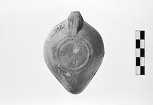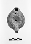 | Description: | Convex sides. On rim, debased herringbone. On discus, rosette with pointed petals. Solid handle, with triple groove above and below. Reverse, plain or worn within double circular groove. Buff slip. Reddish-brown clay. Type XXVIII of Corinth collection. | |