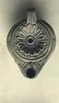 | Description: | Complete. On rim, two grooves, with three small impressed circles along the edge on each side. On discus, a rosette, with pointed petals, and dots between the points. Solid handle, triple grooved above and below. On reverse, a heart-shaped bounding line, enclosing the signature: "EY". Unglazed. Pinkish-buff clay. Type XXVIII of Corinth collection. | |