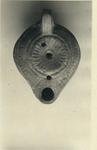 | Description: | Complete, save for a small round hole at the back of the discus, neat, but apparently not an original filling hole. On rim, herringbone. On discus, rays; both patterns very faint. Handle solid, triple grooved above and below. On the reverse, double concentric circles enclosing the signature: "ΔΕΥ". Thin red wash. Light red clay. Type XXVIII of Corinth collection. | |
