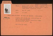| Description: | Fragment of side and reverse. A small bit of the rim, with pattern of wavy lines, preserved. On the reverse, double concentric circle enclosing the letter "E". Red wash and clay. Type XXVIII of Corinth collection. | |
