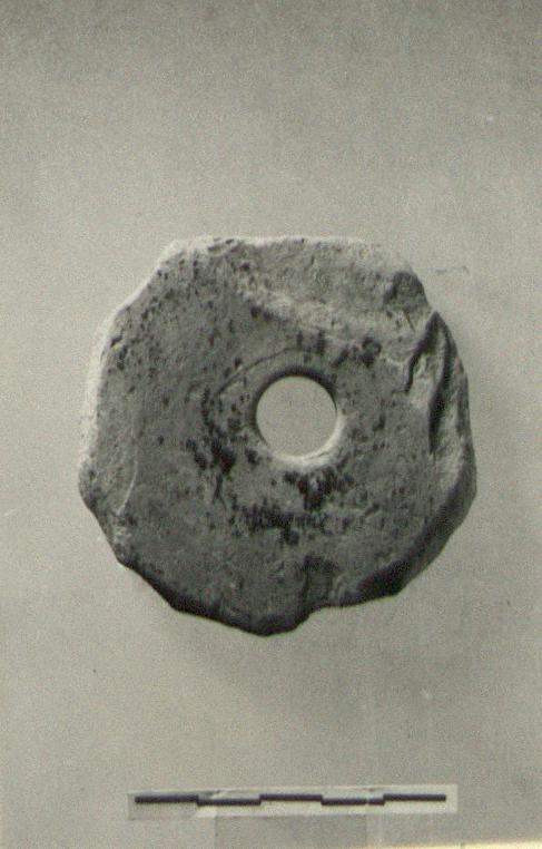 | Description: | Roughly cut perimeter. Hole in center has been smoothed by an axle. Traces of black glaze on both sides. Buff clay. | |