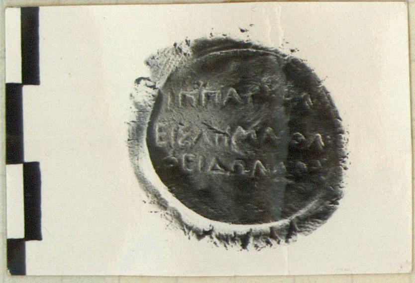 | Description: | Intact. Obvese: inscribed. It has three lines of text made of an ovoid seal. Reverse: plain. Pink clay. Similar to MC 1174 and from seal 2-type II A. Cf. MC 1174, for the inscription. <graphic> | |