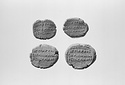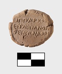 | Description: | Small chips missing. Obverse: inscribed. It has three lines of text made of an ovoid seal. Reverse: parallel striations (traces of the object-wood (?) against which it was affixed). Buff clay. Similar to MC 1164 and from seal 1-type II B. Cf. MC 1187 for the text of the inscription. <graphic> | |