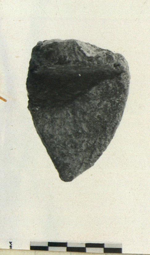 | Description: | Complete. Wedge shaped flat clay turned up at wide end. Clay gray to black and partially vitrified. Cf. AAA (1970), p. 429. | |