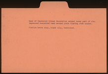 Band of impressed linear decoration around lower part of rim. Impressed rouletted band around plain flaring stem socket.