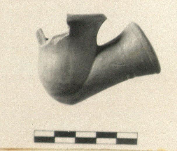 | Description: | Three-fourths of rim broken away. It is of lily type with heavy, angular keel; smooth bowl merging into flaring heavy lip; flaring stem socket with two bands of rouletting partially encircling it. Orange clay, red slip. | |