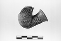 | Description: | Two large pieces missing from rim. It is of lily type (rim and bowl are in one; acute angle between axis of bowl and axis of stem socket) with flaring rim and thickened lip and flaring stem socket. On undersurface of stem end of socket is a seal, tentatively read by N. Stravoulakis as N A K I or T I K A. Decoration consists of elaborate impressed feather or scale pattern over entire pipe except for reserved zones around lip and body and end of stem socket. Dark red clay and slip, burnished to a high glass. <graphic> | |