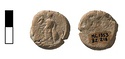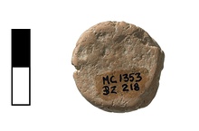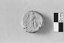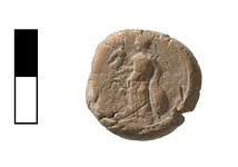 | Description: | Complete fired clay disk with irregular edges. Side A: standing Athena Parthenos with shield by her proper left side and Nike in her out-stretched hand. The accompanying serpent is displaced from its usual position inside the shield to the space beneath the Nike. Side B: plain. Cf. LIMC II, Athena 216, 217, where Parthenos appears on roughly contemporary coins of Side and Aphrodisias. See also Agora X, pp. 117-118, pl. 30, nos. L 301, L 303. | |