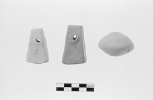 | Description: | Intact, but chipped. Rather crudely formed pyramidal. It has a single, roughly elliptical, suspension hole. Surfaces crudely smoothed. | |