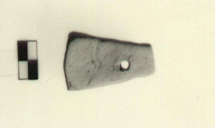 | Description: | Intact, but chipped. Rather crudely formed pyramidal. It has a single, roughly elliptical, suspension hole. Surfaces crudely smoothed. | |