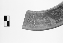 | Description: | One quarter preserved; broken at both ends. Mended from two fragments. Inscribed. Straight wall. On the outer side the letter "A" is inscribed before firing. Buff slip. Worn black glaze on both sides. Very fine, hard, reddish clay. | |