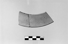 | Description: | Less than one quarter preserved; broken at both ends. Mended from two fragments. Exterior wall concave, interior straight. Light buff slip on both sides. Traces of black glaze on the inner edge. Very fine, hard, reddish clay. | |