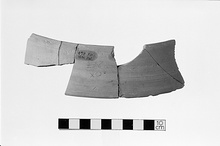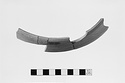 Straight flaring wall with rounded edge, the other inturned and bevelled. Dilute black glaze on interior wall. Finished on one end with a sharp tool.