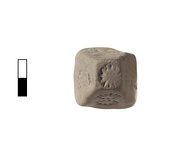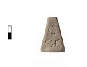 | Description: | Intact. Pyramidal, stamped. Flat top and bottom. Single suspension hole pierced near top. Stamped on four sides and top with star pattern. Two to three per side; one on top. No glaze. Orange fabric. | |