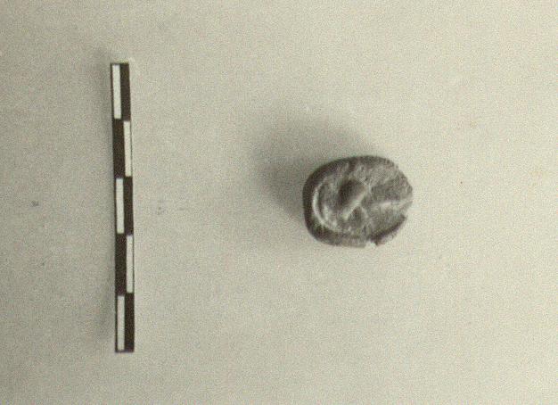 | Description: | Obverse: a peacock on the upper face, standing left, one claw advanced, tail not spread. Reverse: flat, plain. Worn black glaze. Buff clay (?) Cf. MC 279-281, 292-293 which are from the same die as this. | |