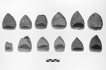 | Description: | A roughly triangular piece with projections at bottom. Light buff clay, traces of pink slip. | |
