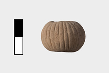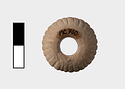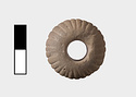 | Description: | Nearly spherical, flattened above and below and pierced vertically; the sides grooved. Unglazed. Buff clay. | |