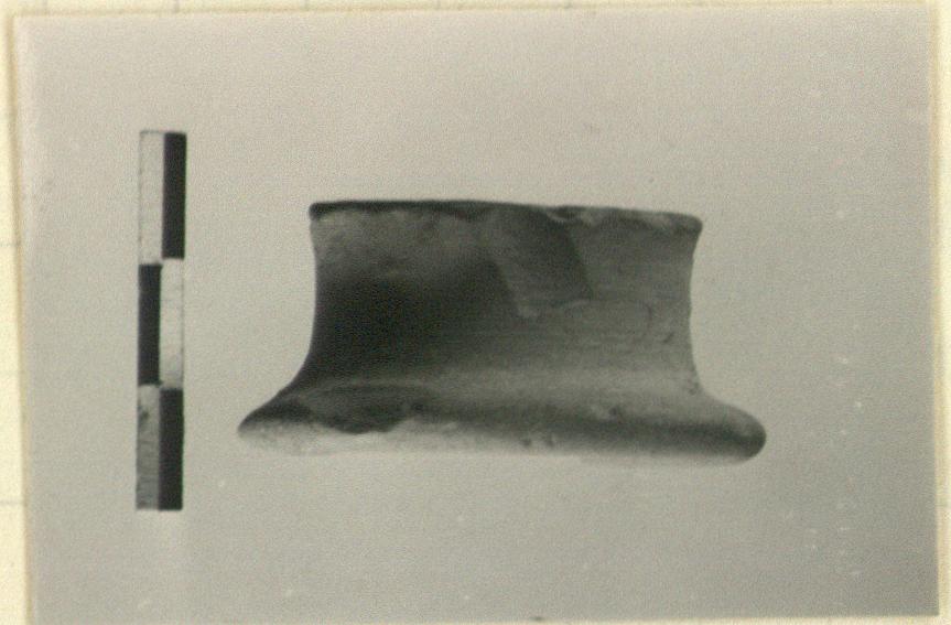 | Description: | Base chipped. Cylindrical with flaring base. Fine buff clay. | |