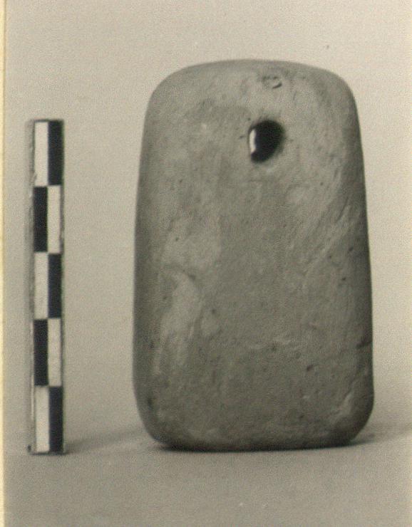| Description: | Pyramidal. Four-sided almost a rectangle in section. Hole near top. Pinkish buff clay. | |