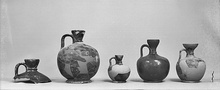 | Description: | Squat round body on ring foot; narrow neck with a raised ring around its bottom and one band handle, shoulder to neck. Good black glaze. | |