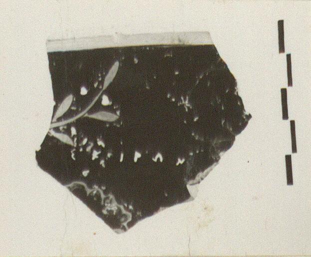 | Description: | From a krater, at top of wall; reserved line below rim, above. Preserved is the top of a head, right, and above an olive branch with berries. Letters in white over the head: <graphic> Glaze somewhat greenish outside. ADDENDA Probably calyx-shaped wall. | |