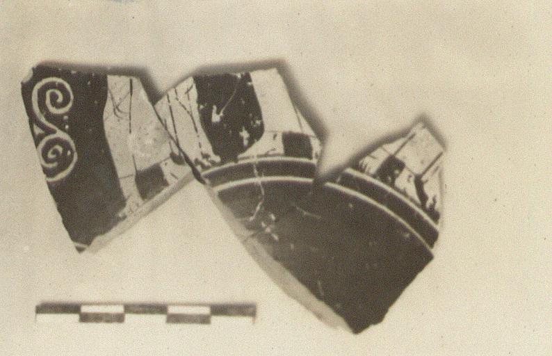 | Description: | In medallion bordered by maeander, two nude youths facing each other. Outside, the bottoms of three cloaked figures, and a bit of handle ornament. Double reserved ground line. Relief contour for brow-nose line on interior. | |