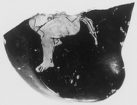 | Description: | A corner fragment; on one face, the lower part of a nude satyr, running left (or sitting on the ground with one knee bent up?). Partial relief contour. Thick black glaze; brown. | |