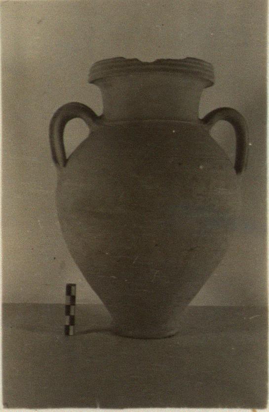| Description: | Fragments of lip and mouth missing; otherwise intact. Small ring foot; handles roughly grooved; outer edge of lip grooved. Buff clay. Light buff slip. | |