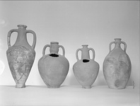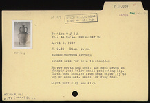 | Description: | Intact save for hole in shoulder. Small low ring foot; narrow neck and mouth; the neck drawn in sharply just below small projecting lip; thick band handles, from neck below lip to top of shoulder. Light buff clay and slip. | |