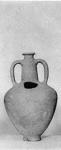 | Description: | Intact save for hole in shoulder. Small low ring foot; narrow neck and mouth; the neck drawn in sharply just below small projecting lip; thick band handles, from neck below lip to top of shoulder. Light buff clay and slip. | |