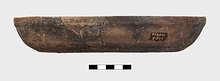 Description:   Mended from many pieces; small fragment of rim missing; minor fractures at edge of breaks. Flat bottom; curving sides; flat-topped rim, slightly sloping inward. Interior: good dull red glaze. Exterior unglazed, blackened by fire.
