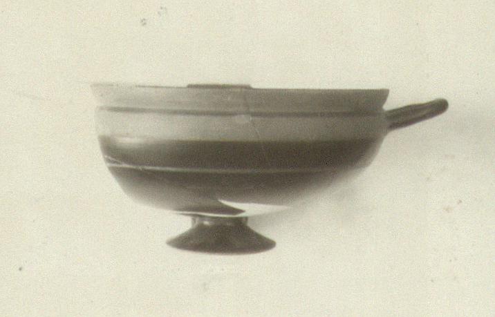 | Description: | Mended from many fragments; half the lip and nearly one-third of the body wall restored in plaster, together with one of the handles. Low flaring foot; deep bowl; narrow offset lip. Inside black glazed with reserved line at upper edge of lip. A line of glaze around the top of the lip. The outside reserved from the lip to the lower line of the handle attachment, with a narrow band of glaze around the cup at the offset line. A narrow reserved band around the lower part of the body. Underside of foot unglazed, decorated with two concentric bands and a central dot. Extremely fine, thin fabric; pinkish-buff clay. Firm lustrous black glaze. | |