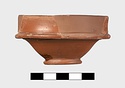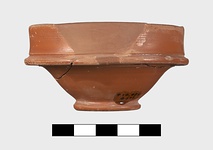 | Description: | Mended from a number of pieces; fragments of keeled rim missing. Small low ring foot. Under foot, a graffito: <graphic> Buff clay, rather like "Attic". Orange-red glaze, quite firm. Cf. Agora XXXII, no. 778 (P 9171). | |