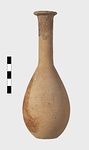 | Description: | Chip of lip missing; otherwise intact. Small flat bottom; elongated globular body; long neck. Thin dark glaze around mouth inside and out. Exterior otherwise unglazed. | |