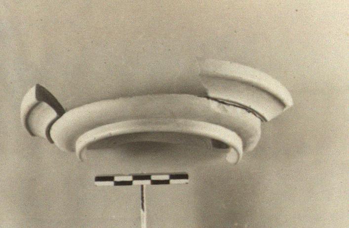 Description:   About half the floor and two fragments of the rim preserved. Ring foot; flat floor; flaring rim with vertical edge. Two grooves inside at edge of rim and at outer edge of floor. Exterior heavily moulded to foot; inside foot, two grooves.