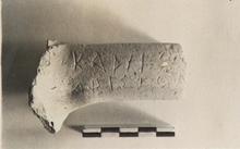 Description:   Fragment from the handle of a coarse amphora; a stripe of brown glaze down its outside.