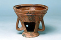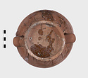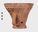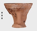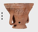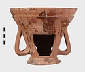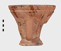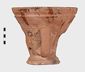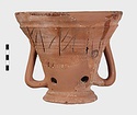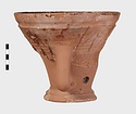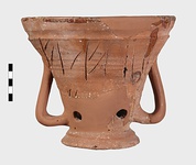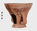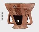 | Description: | A small piece of the rim, parts of the base, and both handles, except for one lower attachment, missing. Deep inner bowl with moulded rim and flat bottom. High narrow base on concave foot, with a large rectangular opening on one side, and on the opposite side at least one small round hole. Two vertical handles attached at base of bowl and just above foot. Brown glaze on inside of bowl; splashes of glaze and irregular gouges on outside. Coarse red clay. | |