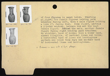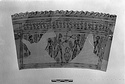 | Description: | Much of body and neck, one handle and all of base missing. Restored in plaster. Slender body; straight neck, outcurving rim with snakes in relief on it; one strap handle with snake, and snakes around shoulder. Glaze mostly gone. On preserved part of neck, to left of handle, a band of S scrolls; parts of four figures in panel below. Starting at right, two female figures holding palm branches facing left, then a male figure holding a lyre(?) facing them. Some object, perhaps a pointed amphora, between him and the last female figure. Behind the male, another female figure facing right holding palm branches. On shoulder, band of hooks; then a wider band, almost illegible, of vertical lines and waves; a horizontal band of lines and herringbone pattern and below this rays and another band of horizontal lines and herringbones. | |