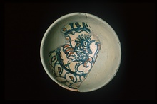 | Description: | Small bowl with vertical rim. Pale green glaze outside; inside a cock in blue with touches of red. To right, guilloches below rim. | |
