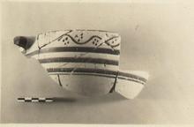 | Description: | Fragment from upper wall and rim with part of one handle. Rim rabbeted to receive lid. In rim panel a wavy line with dot rosettes in waves. Panel closed toward handles by groups of vertical bars. Below the panel, three broad and one narrow band. Around the base, rays. Handles spurred. | |
