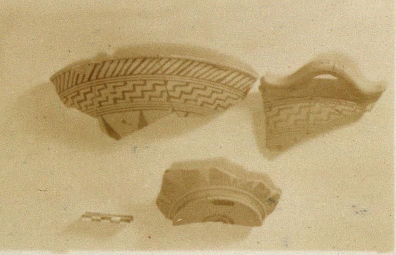 | Description: | Three fragments preserve nearly half of the rim and part of the bottom, not joining. Flat bottom, low base, slightly outcurving lip flat on top; at one point a shallow depression for pouring; one horizontal handle preserved, at rim. Decoration on outside, starting at top: band of diagonal lines, band of zigzags, rays. Two circles in center of bottom. Buff clay; interior covered iwth black to red glaze. | |