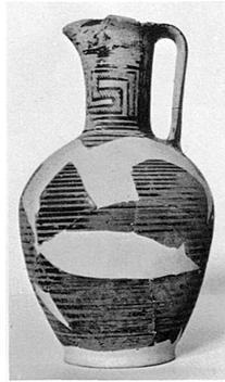 Description:   Mended from many pieces; base, and parts of wall and lip missing. Body black above foot, then covered with horizontal bands to base of neck. On neck, panel with plain maeander. Dots on edge of lip; crossbars and St. Andrew's cross on handle.