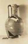 | Description: | Mended from many pieces; base, and parts of wall and lip missing. Body black above foot, then covered with horizontal bands to base of neck. On neck, panel with plain maeander. Dots on edge of lip; crossbars and St. Andrew's cross on handle. Buff clay; glaze black to red, somewhat peeled. | |