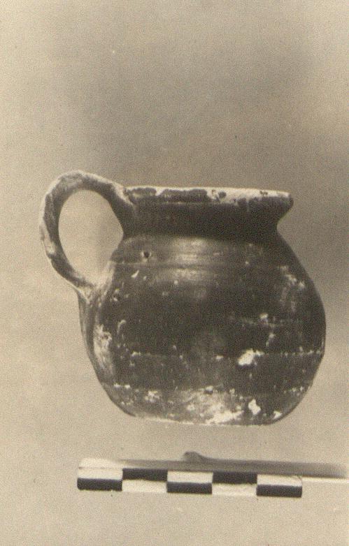 | Description: | Round-bodied jug with flat bottom; round mouth and one vertical band handle. Dull black glaze. | |