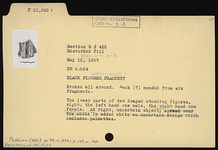 | Description: | Broken all around. Neck(?) mended from six fragments. The lower parts of two draped standing figures, right; the left hand one male, the right hand one female. At right, uncertain object (chair?); foot of a couch in added white. | |